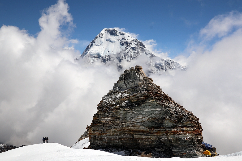 Von Khare (4900 m) aus sind wir am 10.04. ins 5230 m hoch gelegene Basislager aufgestiegen und haben dort unsere erste Nacht im Zelt verbracht. Am Tag darauf ging es hinauf ins Hochlager auf 5800 m. Noch vor 12 Uhr kamen wir dort oben an.