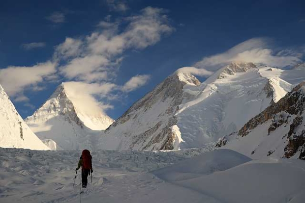 Nachdem der etwa 400 m hohe Eisbruch überwunden ist, öffnet sich ein außerordentlich weitläufiges Hochtal, welches von den sechs Gasherbrums eingerahmt wird. Im Bild der Gasherbrum II (8035 m) rechts sowie zwei seiner kleineren Geschwister (III und IV).