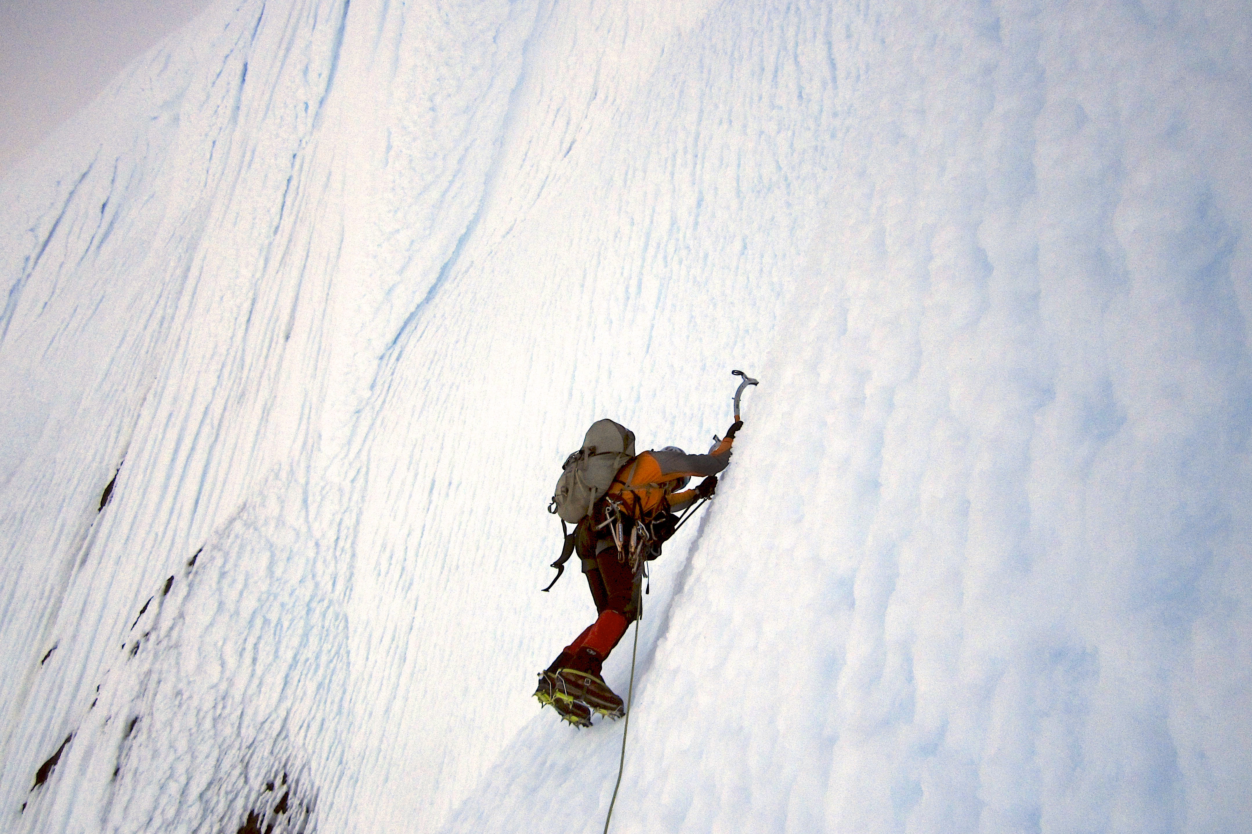 Im Vorstieg in der 600 m hohen, fast senkrechten Raueiswand an der Südwestflanke des Monte Sarmiento auf Feuerland 2016. Bis heute hat dieser unfassbar schöne Gipfel nur eine Besteigung und zählt zu den schwierigsten Bergen der Welt. 50 m unter dem höchsten Punkt mussten wir wegen unkalkulierbarer Risiken umkehren. Trotzdem war dieses Unternehmen sicher eines meiner aufregendsten und vor allem wichtigsten in den 30 Jahren, die ich nun schon in den Bergen dieser Welt unterwegs bin (Foto: Falk Liebstein)