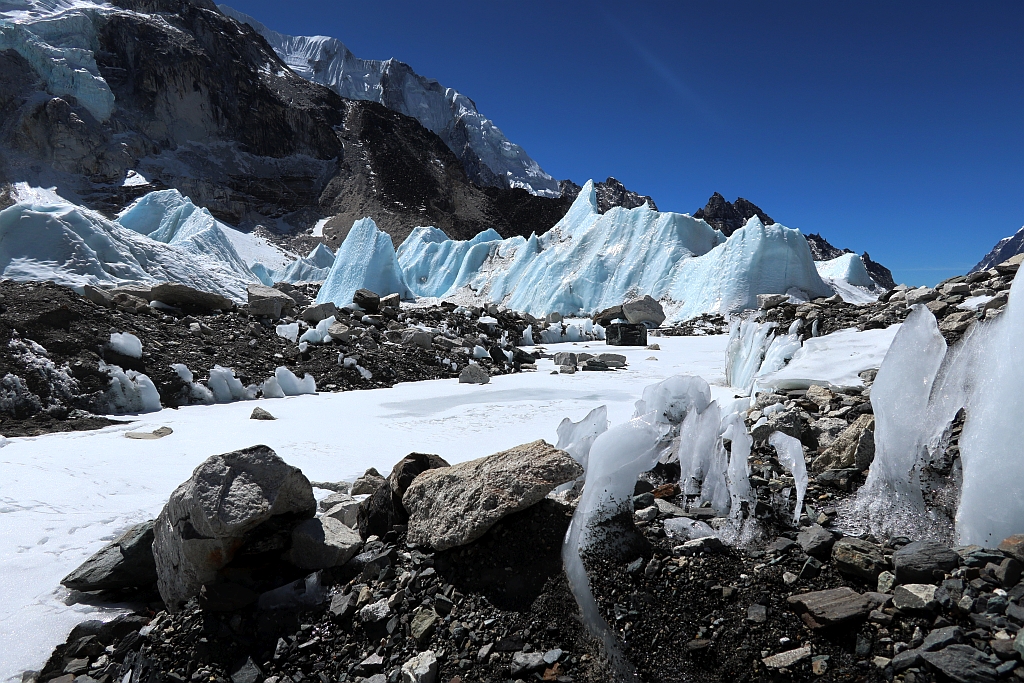 Mich fasziniert an diesem Ort aber am meisten, dass der Khumbu-Gletscher, der soeben in einem beeindruckenden Eisfall 700 Höhenmeter aus dem Tal des Schweigens heruntergeflossen ist, noch sehr jungfräulich aussieht.