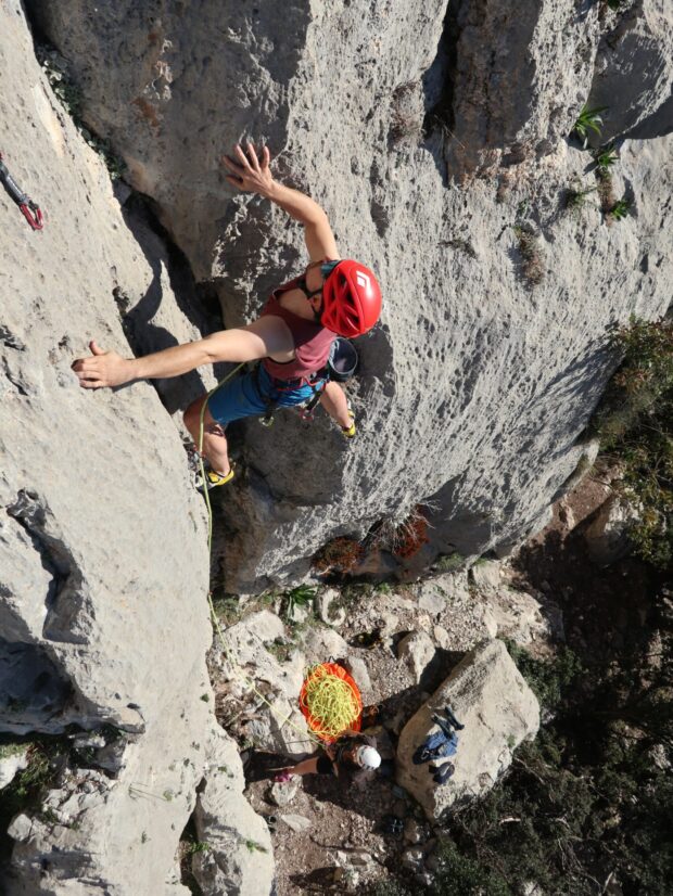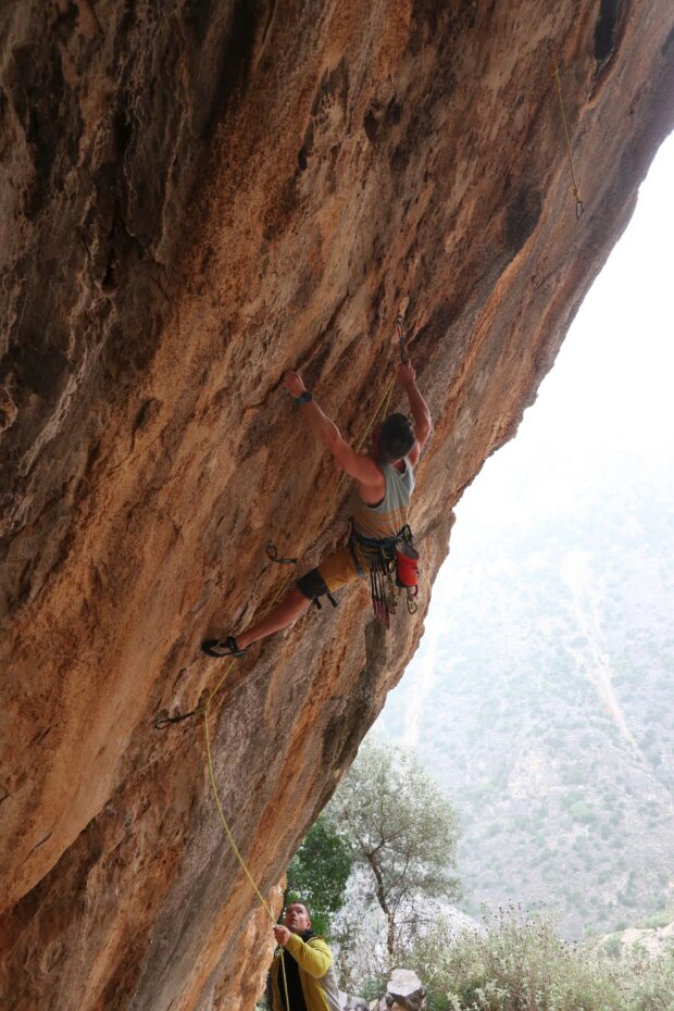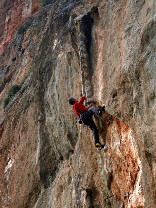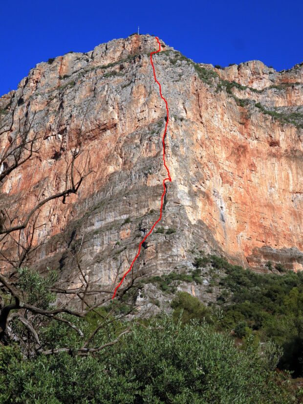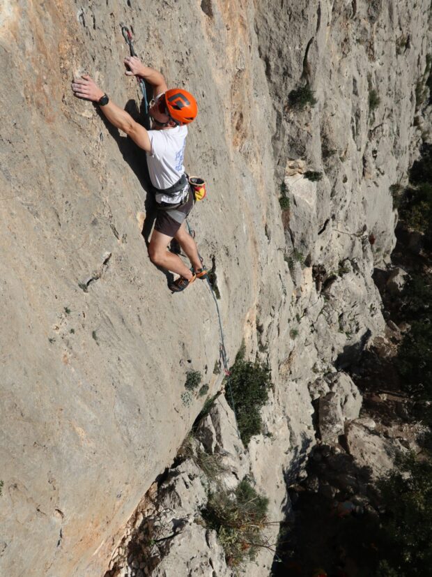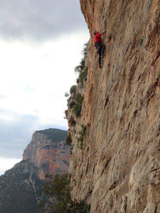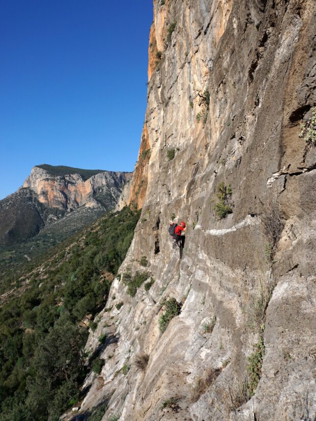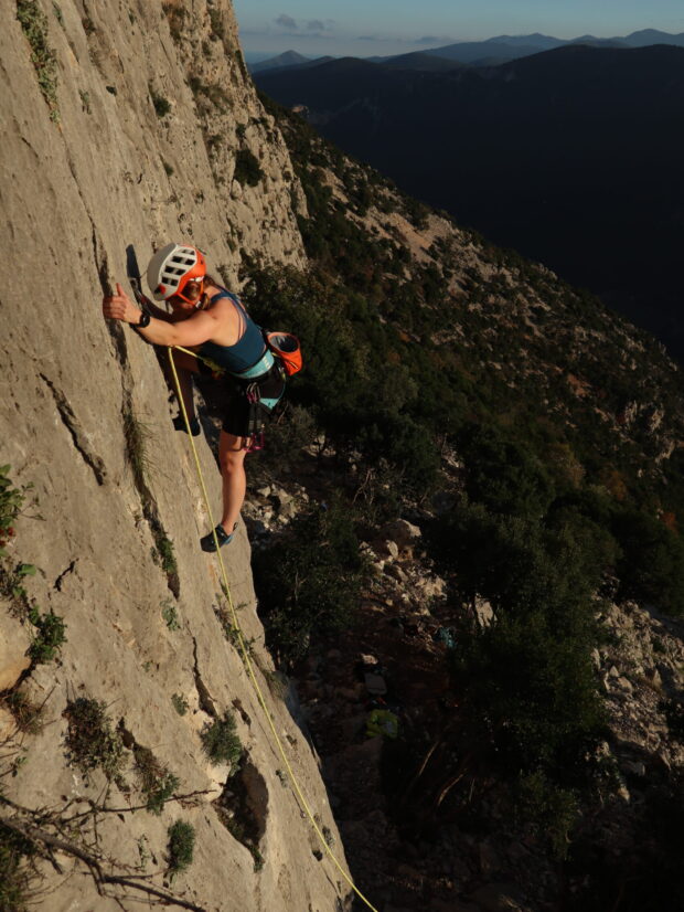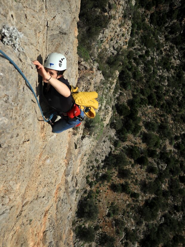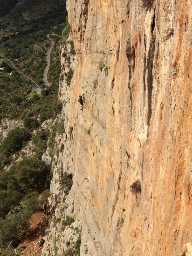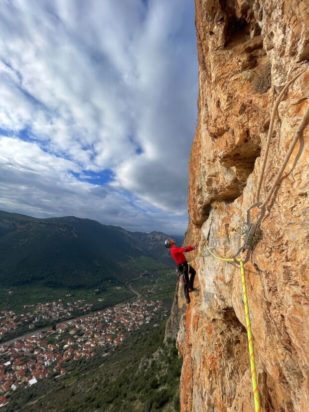Mein persönliches Highlight in Leonidio sind, wie könnte es auch anders sein, die Mehrseillängentouren. Die längste Route ist der „Pillar of Fire“ in seiner linken Variation. Fast 250 m in 8 Seillängen sind zu klettern, und in diesem Weg muss man tatsächlich auch mobil absichern. Nur ganze 17 Bohrhaken waren 2022 in der Route zu finden. Etwas ganz Seltenes in Leonidio. Normal ist diese Menge an Bohrhaken in einer Seillänge!!