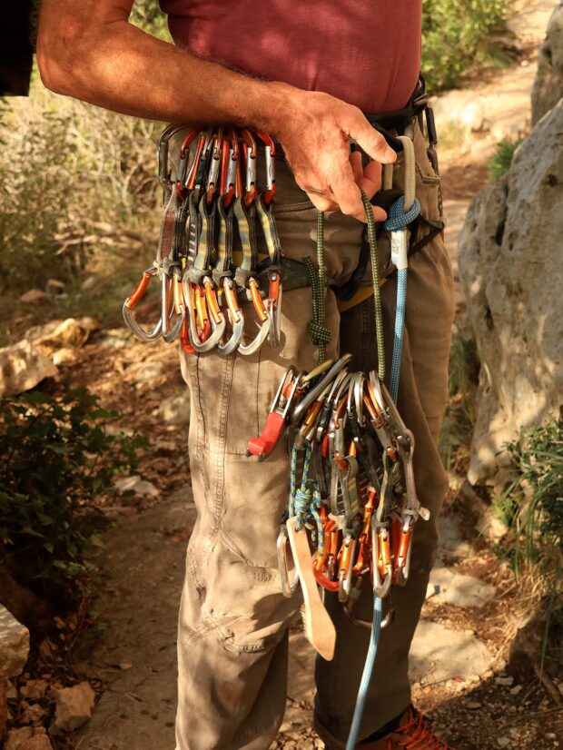 Doch das mit den langen Routen und der Luft unter dem Hintern konnte ich mir abschminken. Mein Klettergast war Sportkletterer. Mit langen Routen hatte er nichts am Hut. Ihm machte es Spaß, für seine Verhältnisse möglichst schwer zu klettern, und dabei wollte er gut gesichert werden. Wenn er irgendwo nicht hochkam, dann musste ich ran und ihm seine Exen holen. Oder ich musste das Seil einhängen, wenn er sich den Vorstieg nicht traute.