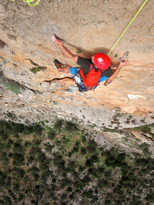 In Leonidio braucht man schon ein paar mehr Exen bei der Bohrhakendichte. Rechts klettert Jacob im Vorstieg in der Route „Kolasi“ im Sektor Yellow Eyes. Hier braucht man sich um sein Leben eigentlich keine Sorgen zu machen, denn der nächste Bohrhaken ist nie weit weg.