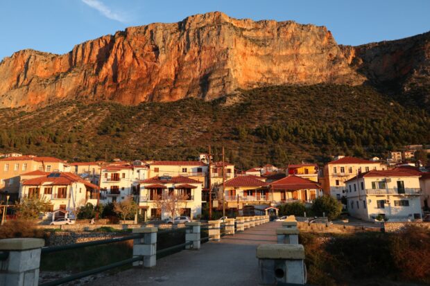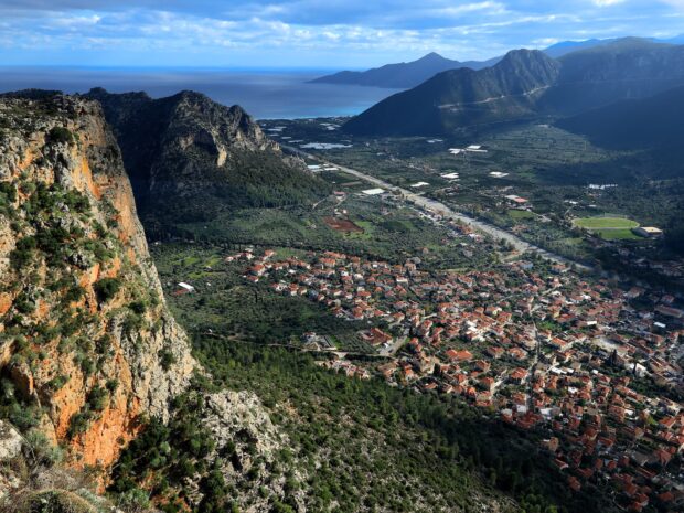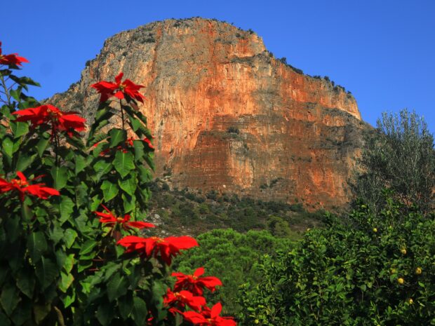 Die „Hauswand“ Leonidios mit Namen „Kokkinovrachos“, was nichts anderes als roter Fels bedeutet. Keine halbe Stunde dauert der Aufstieg vom Ort aus zu den Einstiegen.