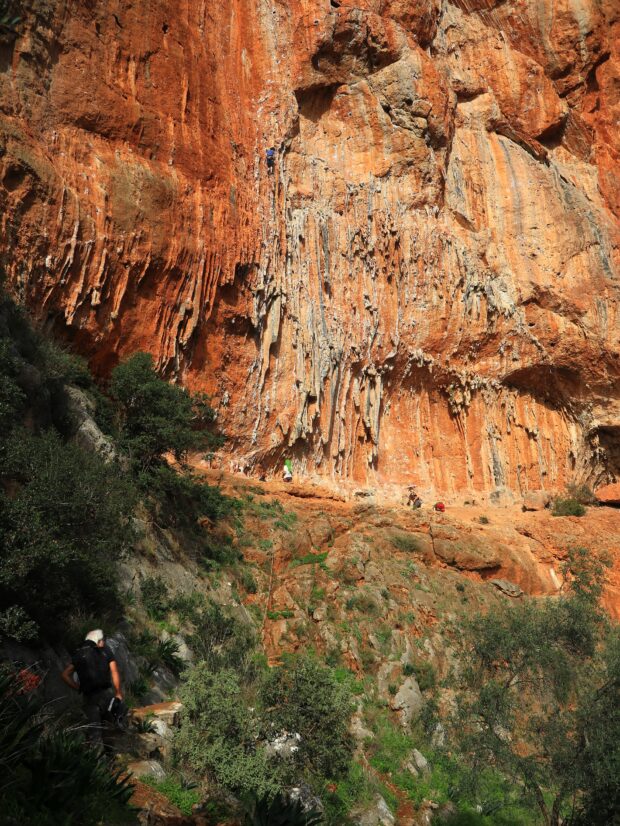 Der oft sehr raue, rotbraune und häufig messerscharfe Kalkstein ist selbst in den angesagten Sektoren und Routen mit wenigen Ausnahmen (noch) kaum bis gar nicht abgespeckt. Die Sohlen der Kletterschuhe finden fast überall soliden Halt. Denn die Routenauswahl in den inzwischen 111 Sektoren ist so umfangreich, dass sich die aus aller Welt eingeflogene Schar der Kletterer gut verteilt. Das gilt insbesondere, wenn man sehr spät oder sehr früh im Jahr angereist ist.