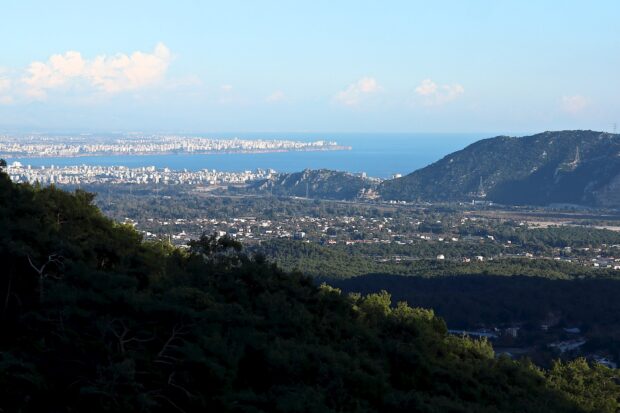 Links der Blick von den Kletterfelsen auf das nur eine halbe Autostunde entfernte Antalya mit seinen Stränden und der sehenswerten Altstadt. Rechts schauen wir auf einen winzigen Teil des kilometerlangen Hauptriegels. Die Zustiegszeit von unserer Unterkunft zu den ersten Routen-Einstiegen betrug 120 Sekunden. So etwas lieben Sportkletterer. Bis um 10.00 schlafen und schon eine halbe Stunde später klettern.