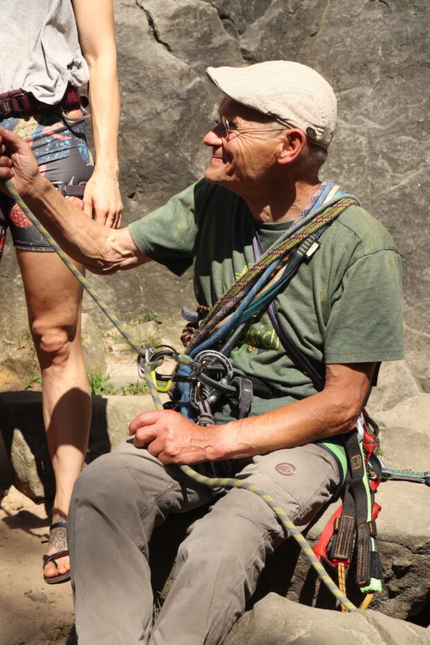 Ich teilte meinen beiden Klettergästen mit, dass sie gerade vor einer lebenden Legende des Sächsischen Kletterns stehen. 900 zum Teil extrem schwierige Erstbegehungen gehen hier auf sein Konto. In den achtziger Jahren war er nicht mehr und nicht weniger als einer der besten Kletterer weltweit. Sein lapidarer Kommentar dazu: “ Das hat alles keinerlei Bedeutung“.