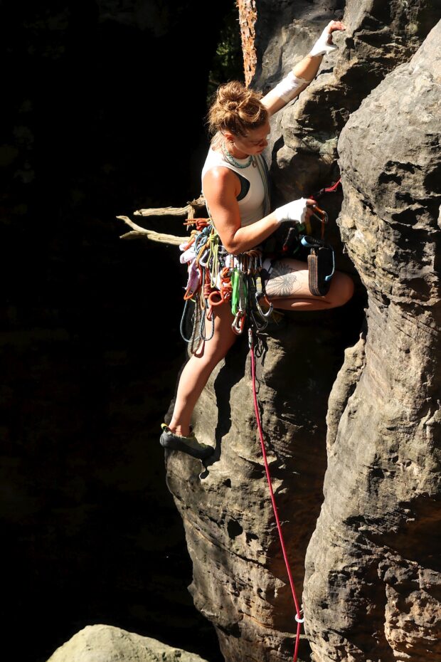 Vorstiegskurs mit Caroline und Uta in der Sächsischen Schweiz. Die beiden Fotos halten gerade ganz spannende Momente fest. Nach zwei intensiven Tagen, an denen vor allem das Schlingenlegen und die verschiedenen Klettertechniken im Vordergrund standen, wird es nun tatsächlich Ernst. Auf dem linken Foto steigt Uta sogleich in ihren ersten im Vorstieg gekletterten Weg im Elbsandstein ein. Und im rechten Bild ist Caroline dabei, während ihres zweiten Vorstiegs ein sogenanntes Ufo zu legen. Alles sehr aufregend, vor allem für mich!