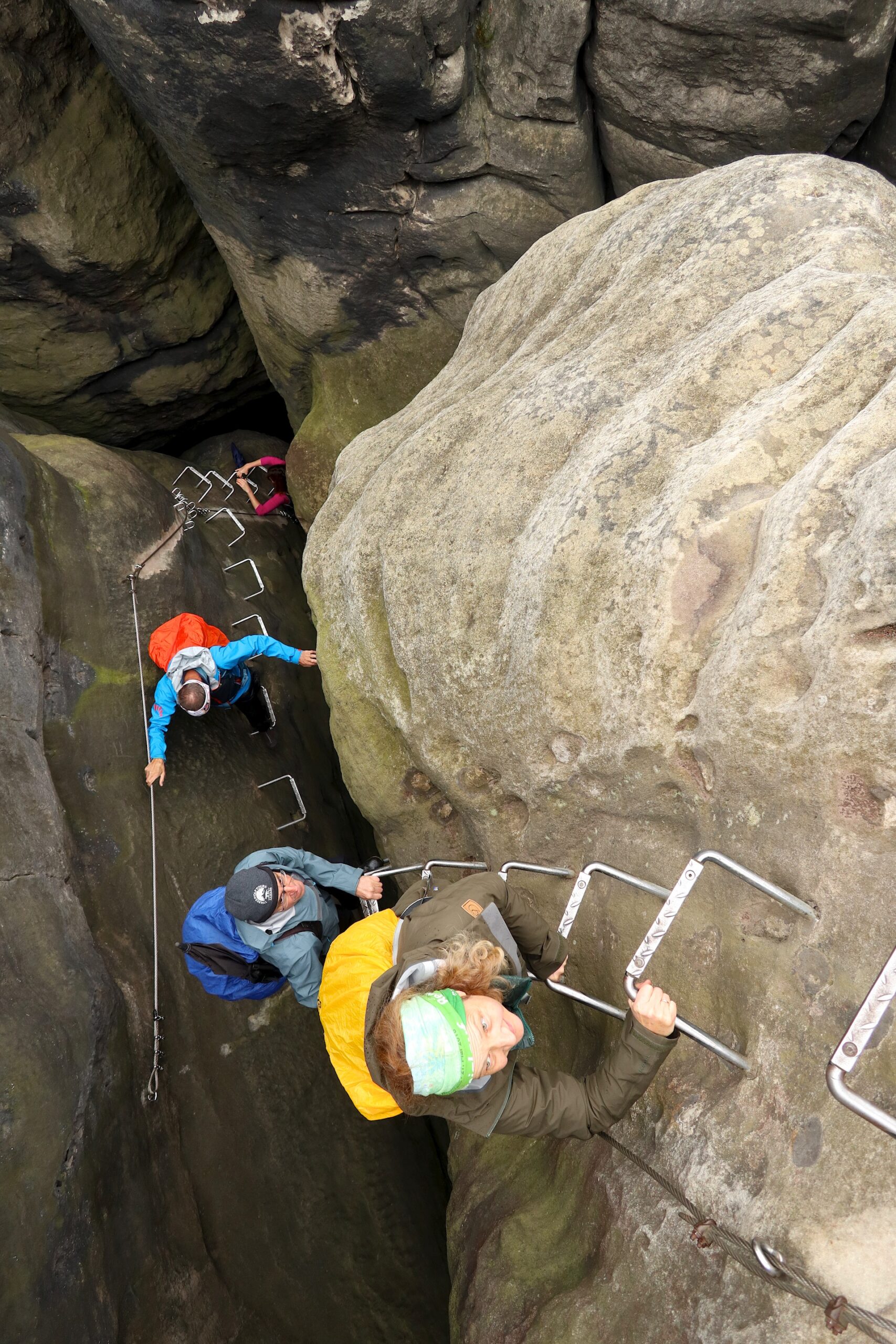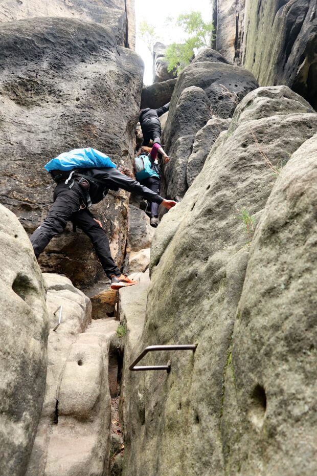 Mein Nepalteam für die Tour 2026 in der Häntzschelstiege links und rechts in der Rübezahlstiege. Vor allem für die Sandsteinneulinge immer ein spannendes Abenteuer.
