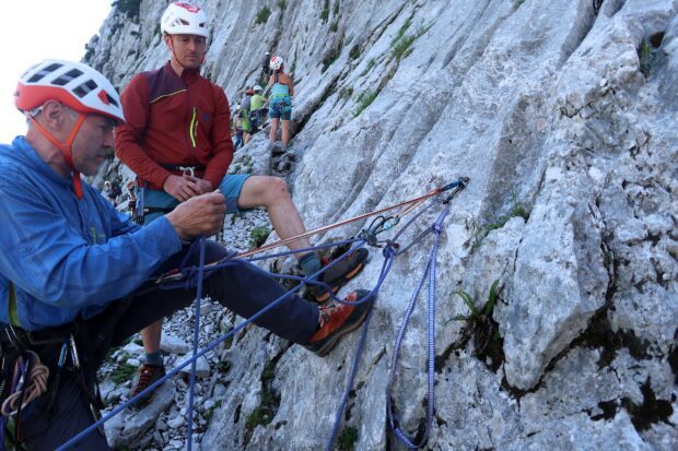 Im August war es wieder soweit. Sechs Teilnehmer haben zwei Tage lang das mobile Absichern mit Schlingen und Ufos geübt und sich sogar auch schon an erste eigene Vorstiege gewagt. Sich im Nachstieg anzuschauen, wie und wo ein erfahrener Vorsteiger Schlingen gelegt hat, ist das eine. Doch selbst gute Placements zu identifizieren und die Schlingen dort sicher aus der Kletterstellung unterzubringen, das andere. All das muss man wieder und wieder üben!