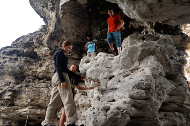 Abendessen in unserer gemütlichen Boofe. Rechts: Bevor es in die Vertikale geht, muss natürlich noch das Wiederrunterkommen geprobt werden.