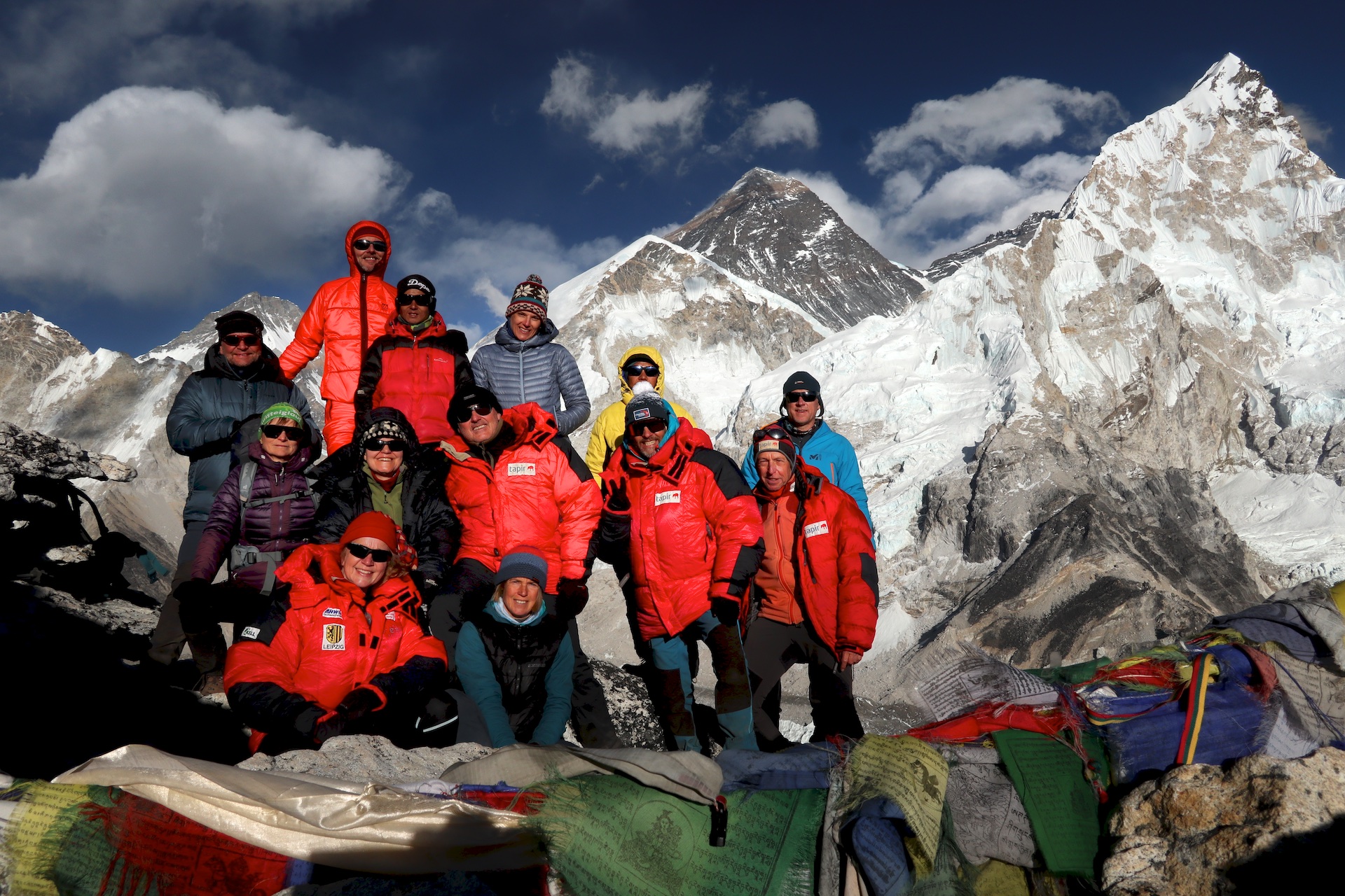 Mein großartiges Vier-Täler-Team vollständig versammelt auf dem höchsten Punkt ihrer Tour (5650 m) vor der makellosen Kulisse von Mount Everest (Mitte) und Nuptse (rechts).