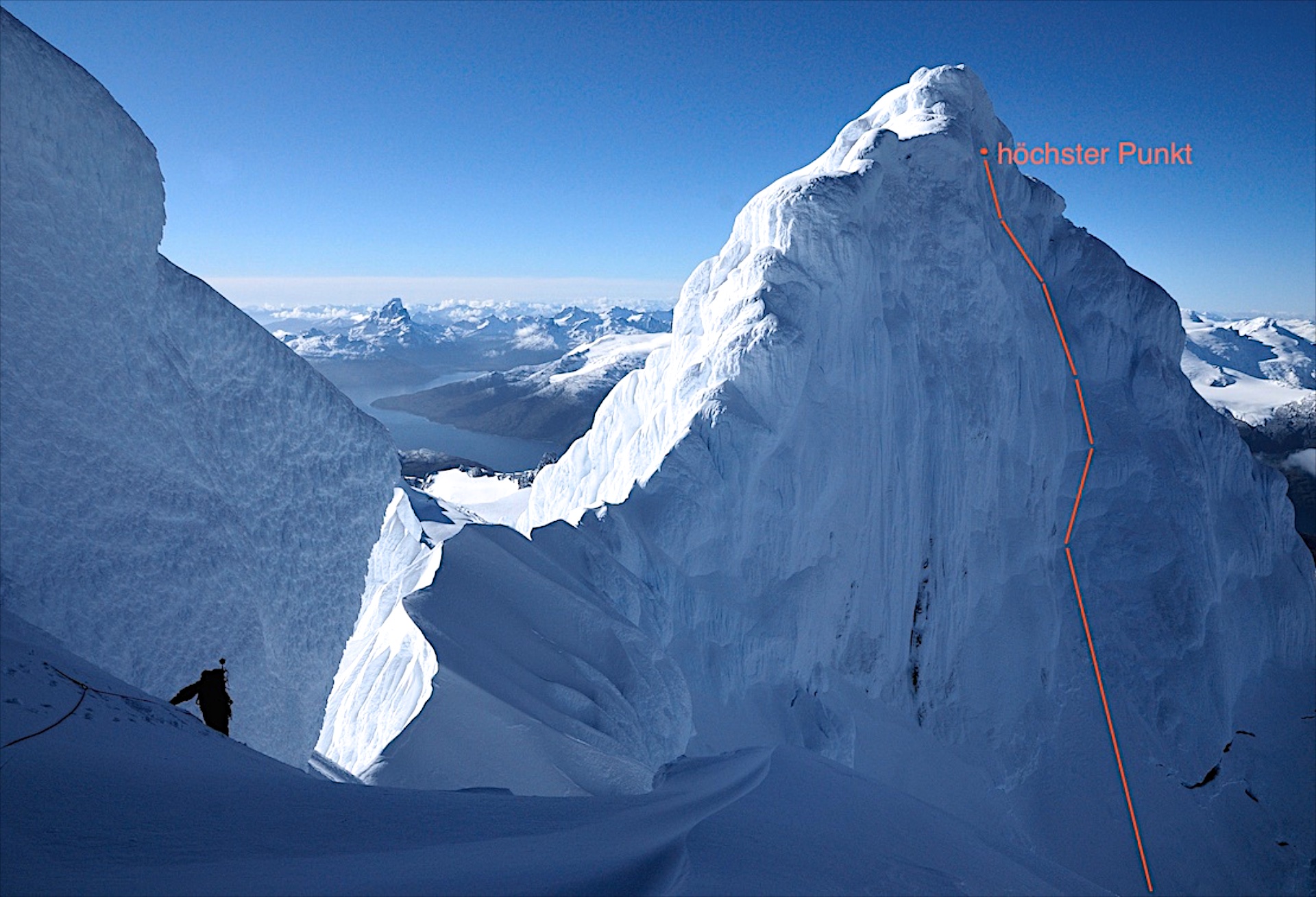 Unsere Route in der 600 m hohen fast senkrechten Eiswand auf der Südwestseite des Berges (Foto: Ralf Gantzhorn).