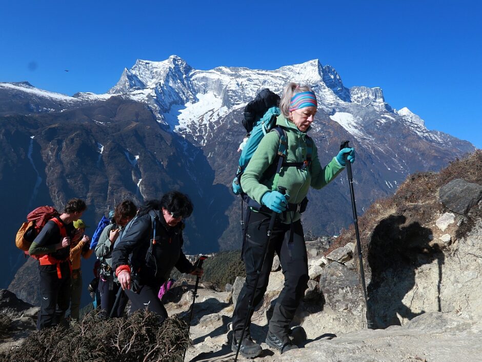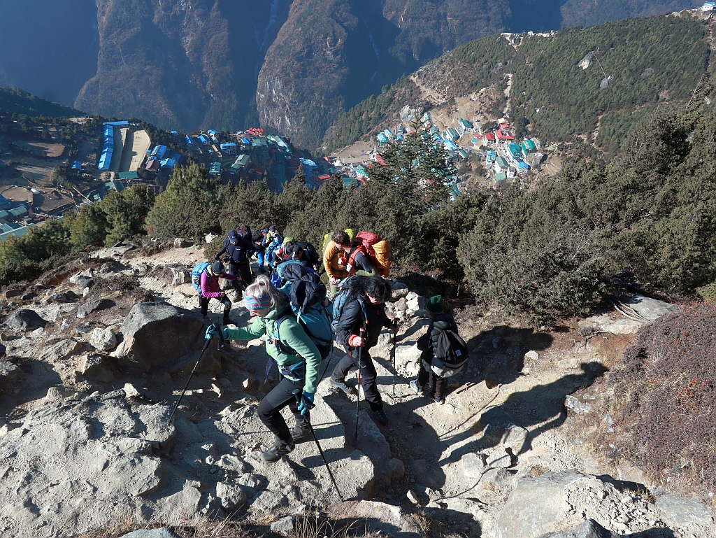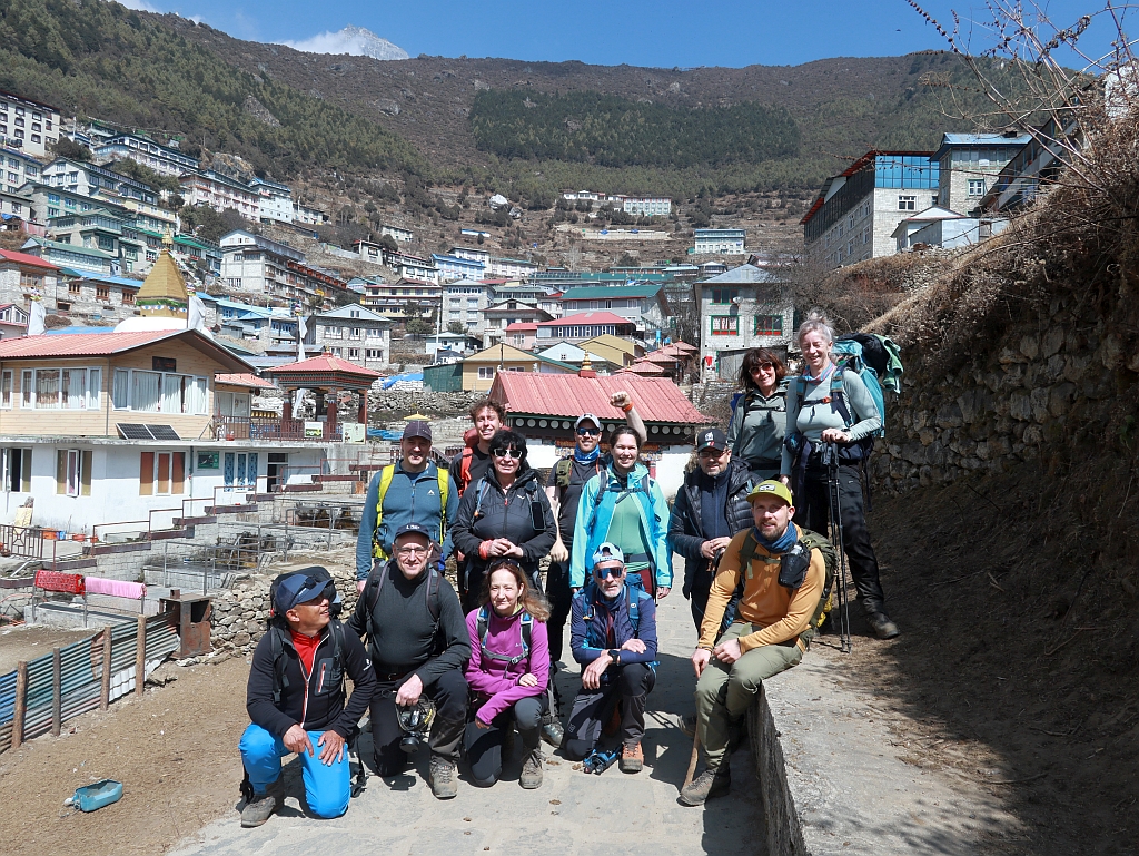 Ein besonderer Moment ist das immer, wenn wir nach dem 600-Höhenmeteraufstieg vor der Kulisse von Namche Basar stehen.