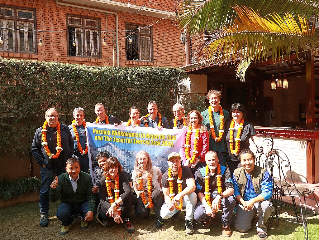 Mingmar, der Chef meiner Partneragentur und mein Freund Te Kumar erwarteten uns freudig am Flughafen. Das tut mir immer besonders gut! Wir bekamen unsere Begrüßungsblumenkränze umgehängt und fuhren ohne Stau und Verkehrschaos in unser Hotel. Es war Samstag und der Samstag hier in Nepal entspricht dem Sonntag bei uns.