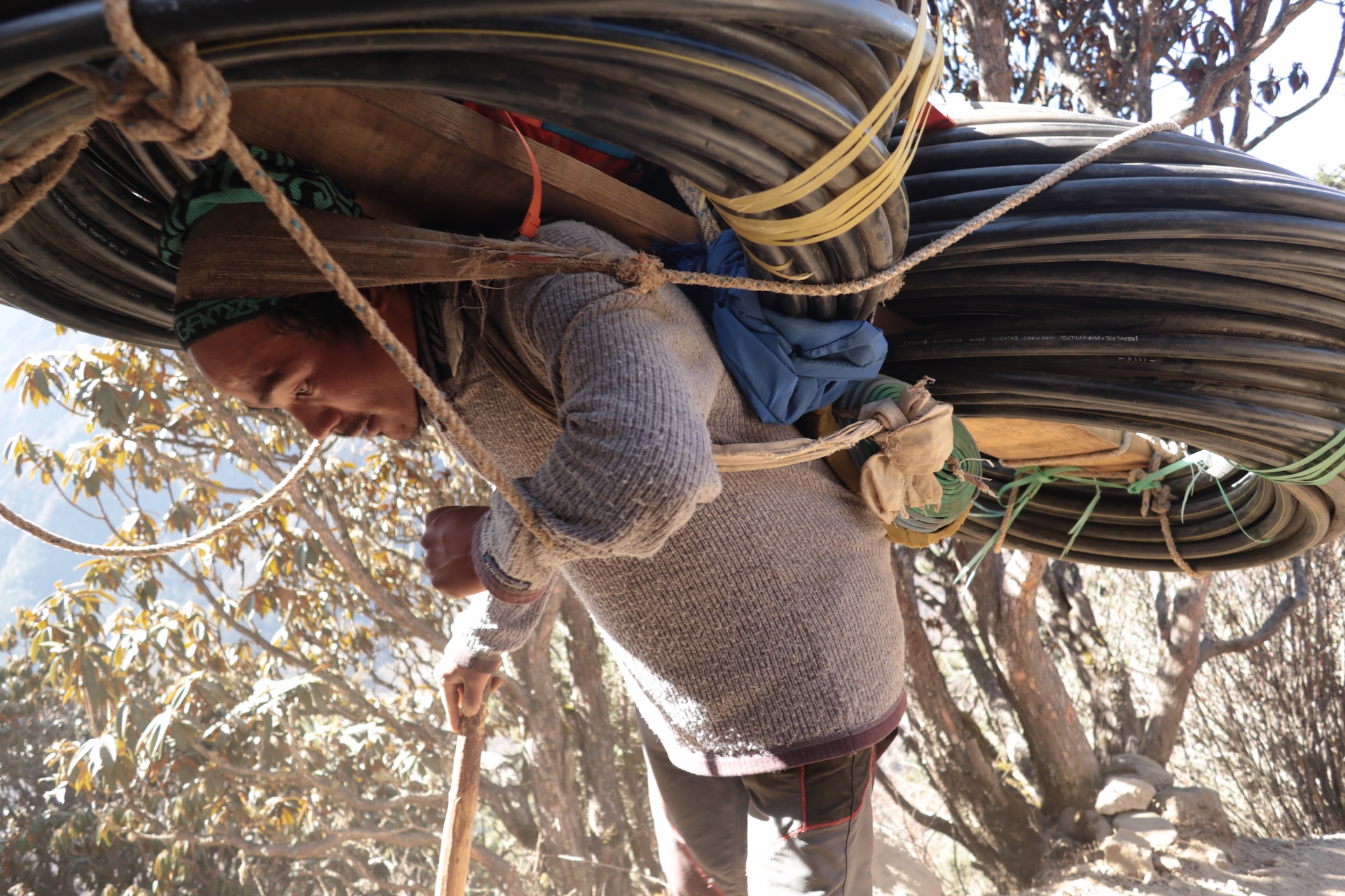 Allein eine solche Last auszutarieren und im Gleichgewicht zu halten, ist auf den oft rutschigen und immer sehr anspruchsvollen Bergpfaden eine ungeheure Herausforderung für die Lastenträger.