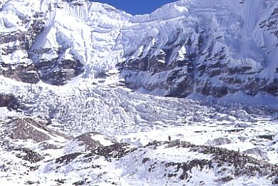 Das Cho-Polu-Basecamp wird durch den kilometerbreiten, wildzerrissenen Lhotse-Shar-Gletscher vom Bergfuß getrennt. Diesen Gletscher zu überqueren bzw. überhaupt erst einen Weg hier hinüber zu finden, war unsere erste Aufgabe. Wie schwierig dies mitunter sein konnte, wußten wir von Frau Hawley. Denn die letzte Cho Polu-Expedition von Japanern 1995 scheiterte genau daran.