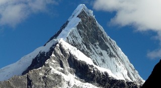 Was für ein Berg! Die wirklich umwerfend schöne Pyramide des Artesonraju aus südöstlicher Richtung vom Nevada Pisco aus gesehen. Wir schauen direkt auf die Südostwand. Quelle: Wikipedia