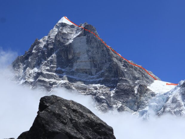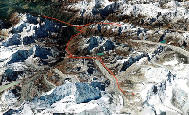 Die anvisierte Aufstiegsroute mit Hochlager am Kyajo Ri.