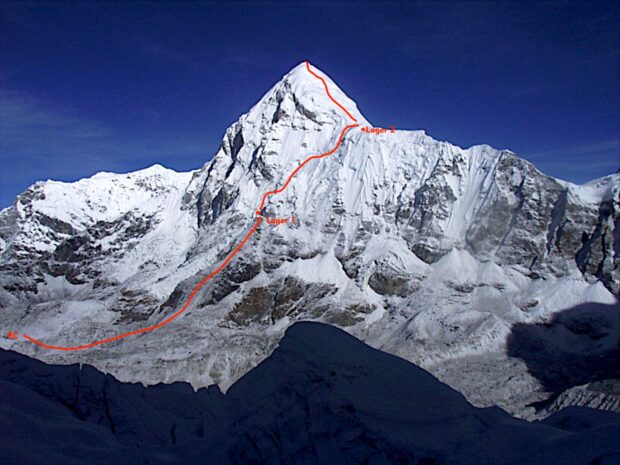 Dieses Foto zeigt den Pumo Ri von seiner Südostseite. Ich habe dieses Foto 2005 während meiner Everest-Expedition noch mit einer analogen Kamera aus dem Khumbu Eisbruch aus ca. 5700 m aus aufgenommen.