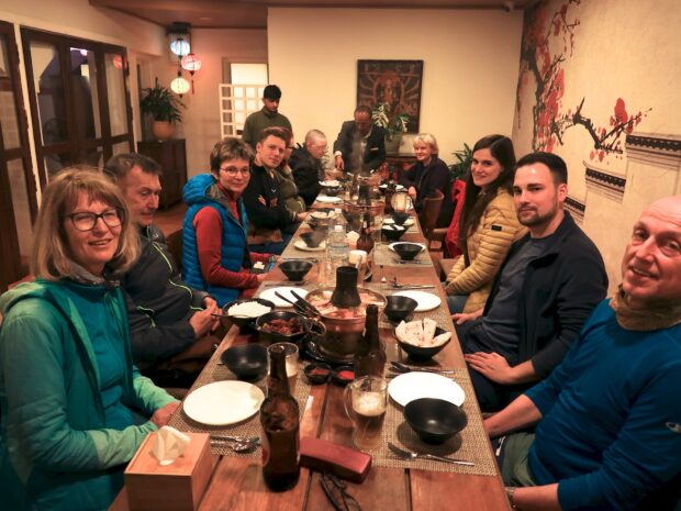 In meinem Lieblingsrestaurant in Kathmandu verbringen wir traditionell unseren ersten Abend in Nepal. Es gibt Hotpot, ein sehr typisches tibetisches Gericht, welches tatsächlich ausnahmslos regelrechte Begeisterung auslöst. Ich gehe übrigens immer wieder in die gleichen Restaurants. Das vermindert die Durchfallgefahr!